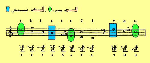 A system of hand signs engraved on several mastabas in Egypt discovered by Professor Hans Hickmann from the Museum of Cairo, called chironomy were carefully analyzed, and from them he developed the various gestures shown on the scale above. The scale is pentatonic with eleven degrees and several modes which were played on instruments as well as sung. Ancient choir directing was originally done using hand signs or signals which qued the choir to various tones of notes and cords.